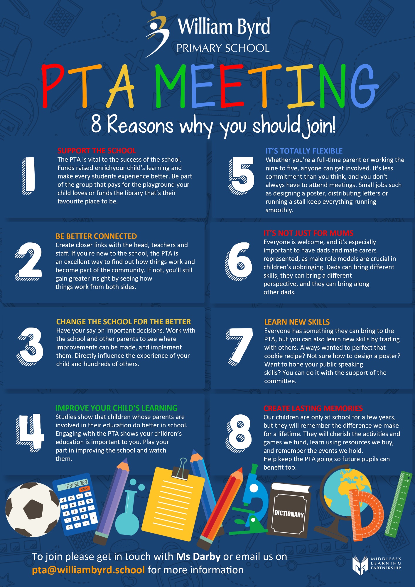A PTA is a Parent Teacher Association, an organisation with a mission to make the school a better place for children to learn. William Byrd Primary Academy PTA brings together parents, teachers and children to raise funds and strengthen the school community.