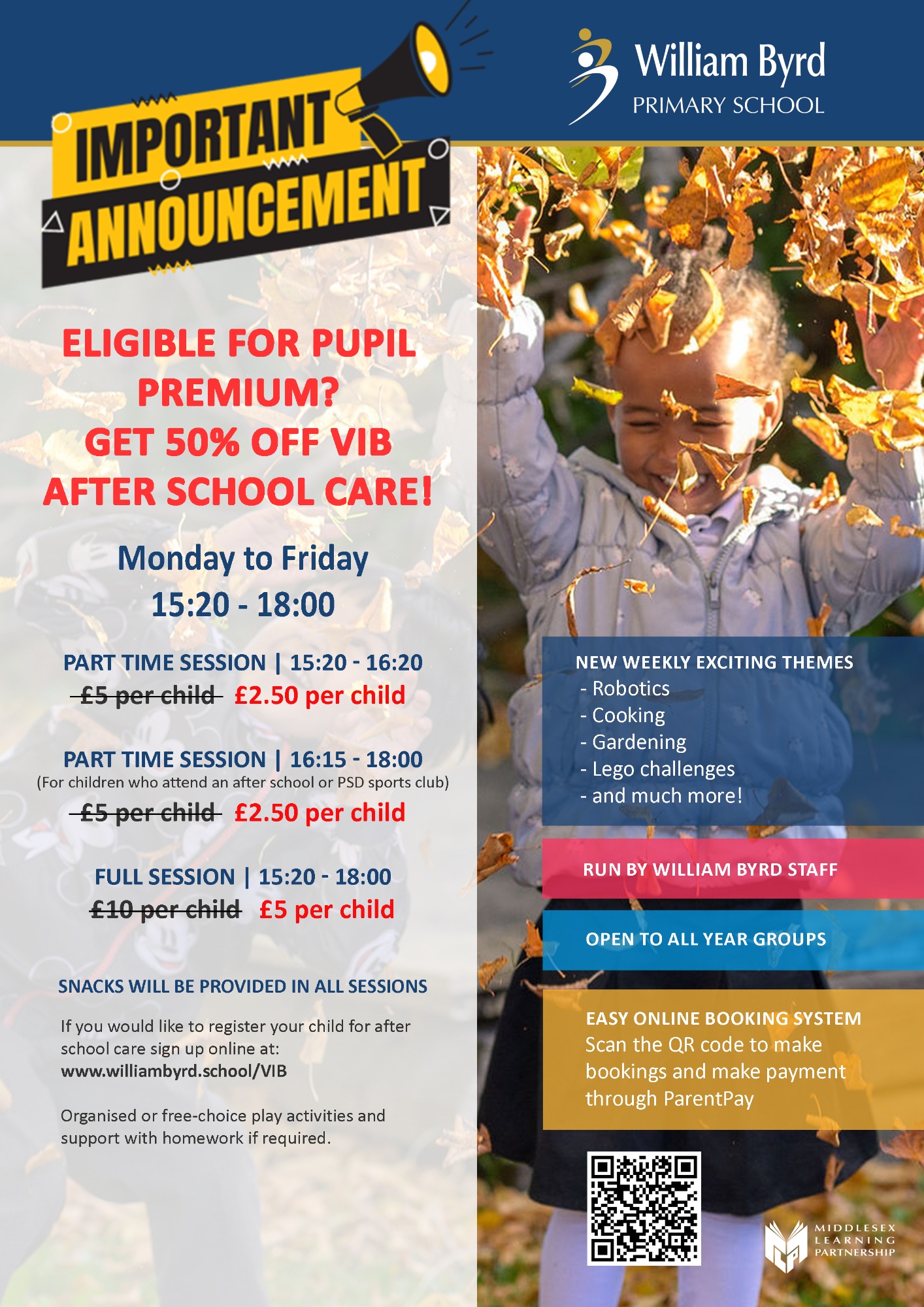 VIB is available from 3:20pm until 6pm, Monday to Friday, during term time only. Please note this will not include the last days of term, when school finishes at 1pm. The club will not operate during school INSET Days when the school is closed to all children.